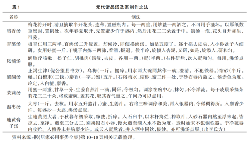 根据以上记载可以看出,诸种汤饮中都加入蜜,其原料多为果、花等,制法讲究,或是上等阶层养身之物。