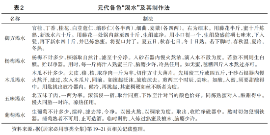 元代的蜜饮,还有一种名为“渴水”的果子露类饮品。“渴水”原名“摄里白”,是阿拉伯语的音译,抑或与这一时期广泛的科技文化交流相关。“渴水”一名的出现,则是本土化的称谓,意即“解渴之水”。“渴水”之饮用,冷热均可,但从资料来看,主要还是作为夏天解暑之冷饮,可以用勺子吃其中的花果碎粒,亦可直接饮用,与现代的冷饮颇为相似。“渴水”之品种和制作方法,非常之繁多,包括了可能从宫廷中流传而来的“御方渴水”,也包括了杨梅渴水、五味渴水、木瓜渴水、葡萄渴水等,其原料、口味及制作方法各异(见表2)。