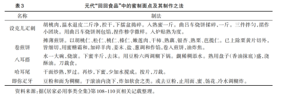 到了元代,见诸史载的蜜制面点更多,与食材的搭配也更加广泛。而且,与这一时期民族融合和大范围的科技文化交流的时代内涵相联系,元代的蜜制面点中还有大量带有显著民族特色的食品,如设克儿疋刺、卷煎饼、哈耳尾、即你疋牙等“回回食品”(见表3)。