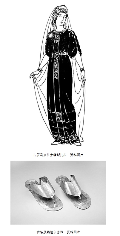 丘尼卡是由古希腊的爱奥尼亚式希顿演变而来,是用两块方形的羊毛织物或亚麻布在两侧和肩部缝合而成,会留有领口和袖口,腰部会用腰带固定。男性穿着时的长度到膝盖部位,女性则长达脚踝,它一般作为内衣穿在托加的里面。斯托拉是古希腊时期爱奥尼亚式希顿的延续,是一种已婚妇女的服饰。这类服装在面料的选择上十分丰富,有羊毛、亚麻和棉。随着中国丝绸的引入,一些社会等级较高的人会选择丝绸制作斯托拉。帕拉是女性穿着的一种礼仪性的服装,它的穿法与古希腊时期的希玛申相同,通常在左胸处用一个圆形的针饰固定。在古罗马人的审美观中,服饰是为了衬托出身体美而存在的。穿着后的布料向下自然垂落,形成丰富的衣褶,并随着人的活动而摇曳变化,勾勒出人体的线条。这种美是人体的真实美,而一块面料无论多么华贵,只有被人穿在身上才能体现出它的价值。