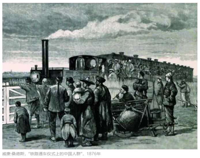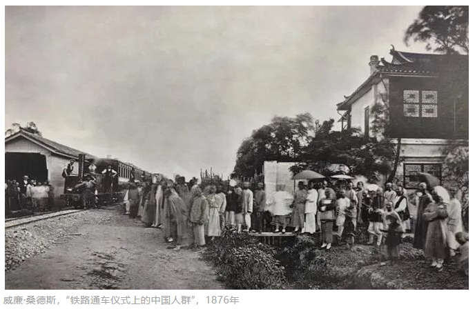 但这条铁路通车时的情形被摄影师用镜头清晰地保留了下来,让我们得以一睹百年前的盛况。最早拍摄吴淞铁路的摄影师目前已知的有英国的威廉·桑德斯与美国的洛伦佐·菲斯勒,1876年7月新版的《远东》杂志曾提到两人作为杂志摄影师共同前往拍摄吴淞铁路通车典礼。威廉·桑德斯拍摄的原片散佚,目前可以通过1876年9月2日《伦敦新闻画报》刊发的吴淞铁路通车典礼场景的版画大致了解照片的内容,因为该版画是以桑德斯的照片为母本制作的,画面中有满载外国人的火车和在一旁围观的中国人。此外,与吴淞铁路相关的老照片还见于1878年理查德·雷皮尔(Richard Rapier)出版的《新兴国家的营利性铁路:浅谈中国第一条铁路》一书,书中刊登了8张采用伍德伯里制版法的照片,展示了当时中国第一个火车头运抵上海、吴淞铁路施工、通车典礼及火车全貌等照片,但并未署名,西方学者判断这些照片的拍摄者应为桑德斯。