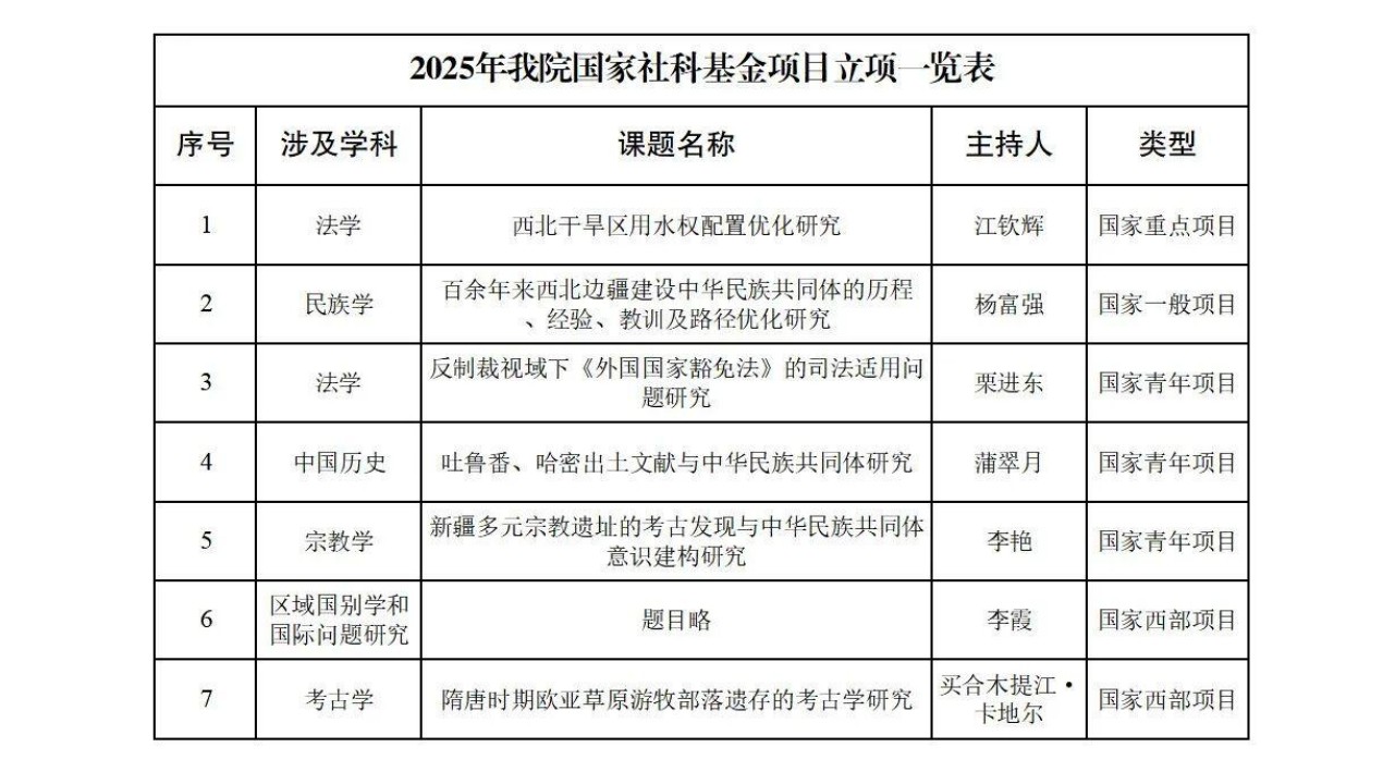 近日,全国哲学社会科学工作办公室发布《2025年国家社会科学基金年度项目立项名单》,新疆社会科学院共有7个项目获批立项,其中国家重点项目1项,国家一般项目1项,国家青年项目3项,国家西部项目2项,涵盖多个类别和学科方向。这是该院在推进构建哲学社会科学自主知识体,开展“有组织成体系集成化”科研组织范式的重大突破。