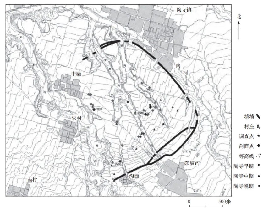 陶寺遗址上也发现有可能是石器生产的场所。2008年的一次调查和试掘发现了一个活动面,这个活动面上有两块磨石、一个矛形坯、几个石块和几片陶片,一条小路连接着活动面和一个陶寺晚期的房基F1。这个活动面也许是F1院子的一部分。调查中还发现一些生产地点,其中包括5个早期、12个中期和15个晚期的地点。这些地点的分布不同时期也有所不同(图1)。陶寺早期,5个生产地点几乎都分布在早期城墙外面,中期的12个地点则都分布在中期城墙的里面,晚期时虽然城墙没有了,但石器生产的地点数量却增多了,在遗址上的分布范围也更广。这种石器生产地点在空间上的变化表明,从早期到晚期磨制石器生产和陶寺精英阶层之间的关系发生了变化。石器生产地点从分布于城墙之外变迁到城墙之内,表明精英阶层对石器生产的控制可能加强。但陶寺晚期石器生产地点数量上的增加表明,陶寺的石器生产可能并不完全依附于精英阶层,精英阶层也没有完全控制石器生产,因为石器生产并没有随着陶寺精英阶层的衰落而萎缩,相反,比早中期更加繁荣了。