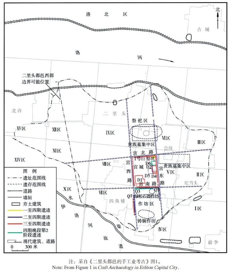 二里头遗址发现60余年来,许多重要发现面世,包括宫城城墙、宫殿基址、不同规模的墓葬、绿松石和制铜围垣作坊,还有一些玉器和青铜器,近年来还发现了井字形道路。从二里头遗址的布局来看,它有明显的城市规划,手工业作坊有专门的区域(彩版四)。绿松石作坊紧挨宫殿区南城墙,铸铜作坊位于宫殿区以南300米,宫殿区位于遗址中心偏东南。在宫殿区和祭祀区分别发现2处制骨作坊和5处骨器加工地点。与绿松石作坊和铸铜作坊这些威望产品位于遗址中心位置不同,遗址上还没有发现大规模的日用石质工具的作坊,仅在宫殿区东北部、西南部、作坊区东北部等存在多处石器加工地点。根据已发表的考古报告,二里头遗址上仅发现石片和石坯283件,但出土有1532件石器成品。与陶寺遗址相较,石片和石坯的数量太少,表明二里头遗址上日用石器的生产活动可能并不很多,石器生产工业可能并不是二里头手工业经济的一个重要组成部分。二里头所需的日用石器可能需要从周围遗址进口,如部分鲕粒灰岩的石铲可能从南面20公里的灰嘴进口。另外,二里头遗址存在石器改制重新利用的现象,如将石镰改制成石刀,说明二里头节约使用石器工具,这可能是由于遗址上石器生产的不足而造成石器工具的短缺。二里头威望产品作坊的出现和日用工具生产活动的减少表明精英阶层可能更重视威望产品的生产,而减少了对日用石器的生产。