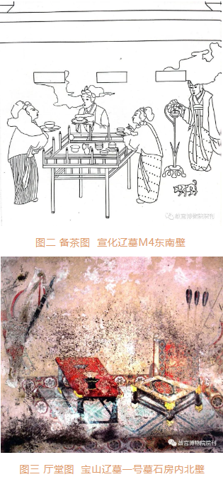 宝山辽墓中发现有天赞二年(923)题记,是迄今发现的纪年辽墓中年代最早的契丹贵族墓。1993年对编号M1的一座大型壁画墓进行了抢救性发掘。宝山M1为砖室墓,由墓道、门庭、墓门、甬道、墓室和石房组成。其中,石房内北壁壁画绘有厅堂图,图中绘有一张红面黑腿几案,案上有一黑色高足盏托,上置一敞口斜壁白釉碗〔图三〕。这里盏托与碗的形象也与王母村唐代崔氏墓中相似。