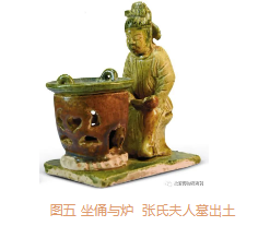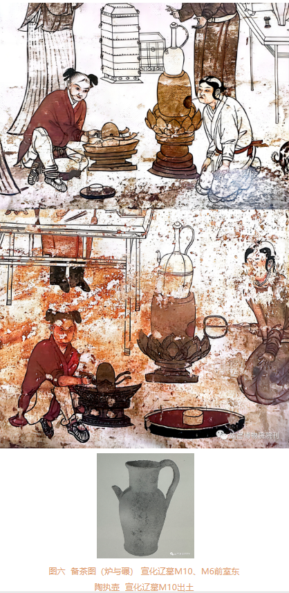 2015年,巩义市文物考古研究所在河南省巩义市东区对司马家族墓地进行了考古发掘。其中,在司马进夫妇合葬墓、司马仲举夫妇合葬墓及张氏夫人墓等墓葬中,均出土了成套的茶具模型,包括坐俑、炉、茶盘、执壶、茶碾、盂等〔图四,图五〕。而在宣化辽墓M6、M10东壁壁画中,均绘有茶碾与炉;在宣化辽墓M1、M2、M5、M7等墓葬中,则出土有陶执壶,执壶形制与巩义司马家族墓出土执壶相一致〔图六〕。唐司马家族墓中还出土了多个茶桌模型,其上均放置有茶碗、盘等,盘内还装有茶点食物,这与宣化辽墓M7后室木案上的陈设相类似,均为模仿墓主人生前的生活方式所作。由于饮茶方式的改变,唐墓中所见部分器物已不见于辽墓及壁画,执壶等器物形制随饮茶方式的变化也已有所改变,然而据唐李匡乂撰《资暇集》“注子偏提”条记载,可知唐代注子之器形来源于罂,加盖、嘴、柄而成。罂是汉以来就流行的器形,考古发现在唐宋时期的墓葬中,也有许多自铭为“罂”或“粮罂”的器物 。后世所谓执壶即为唐代所用注子、偏提之类,即便形制有变,仍应本于此。
