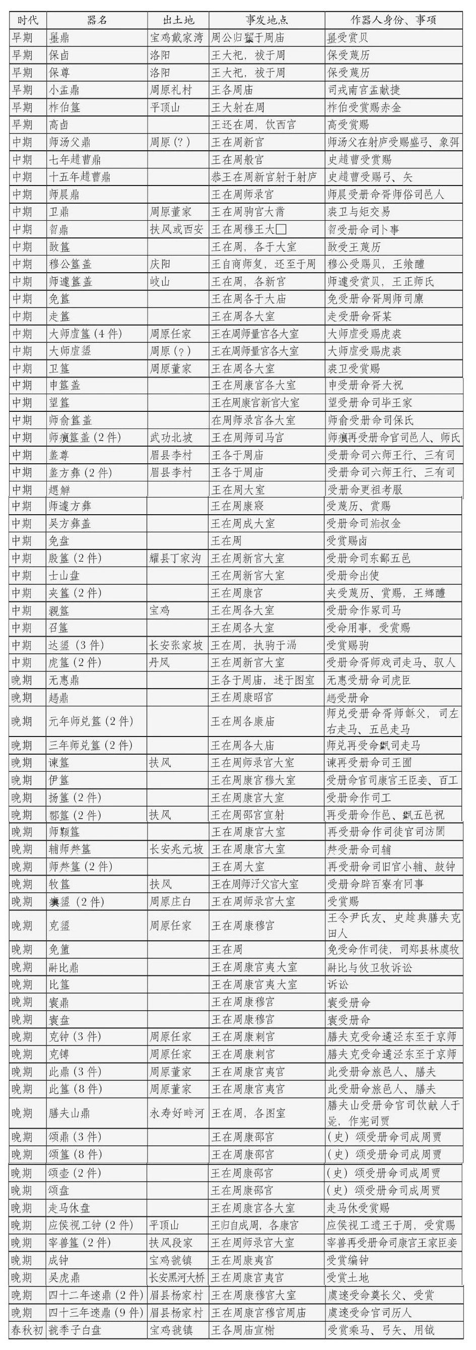 除了上述证据,有铭铜器的出土地也很能说明问题。笔者统计了铭文含“周”地,且所述事件发生在“周”地的铜器出土地(表一)。这样的铜器目前见有121件,其中69件有出土地信息,32件出土于周原地区,其他的散见各地。被一些学者认为是周地的丰镐或洛阳分别只出土了5件和2件。这些铜器的主人是周人贵族,铭文内容大多是他们在周地接受册命,作为官员为王朝服务。这一方面说明周地是行政中心,另一方面也揭示了铜器出土于周原的原因。举例来说,生活于西周中期的贵族裘卫,他曾在周的大室接受王的册命,也曾在周驹宫举行的典礼前与其他贵族发生涉及皮毛的交易,学者指出他的职务是《周礼·天官》的司裘,属王室官员之一。裘卫家族的铜器即窖藏于周原遗址的董家村西。再如毛叔之子师汤父,他曾在周新宫的射庐接受周王赏赐的弓、矢,由此推测他服务于周举行的射礼,或直接参与了射礼,并且表现优异,他的称谓“师”也说明他是一位王朝的军事官员。师汤父的墓葬发现于周原遗址的齐家村东。记载周地之事的铜器集中出土于周原,直接原因是贵族在周原为官,他们生活于周原、埋葬于周原,其铜器铸造于周原、使用于周原、作为财产随葬或窖藏于周原——周原就是铜器铭文中的周。