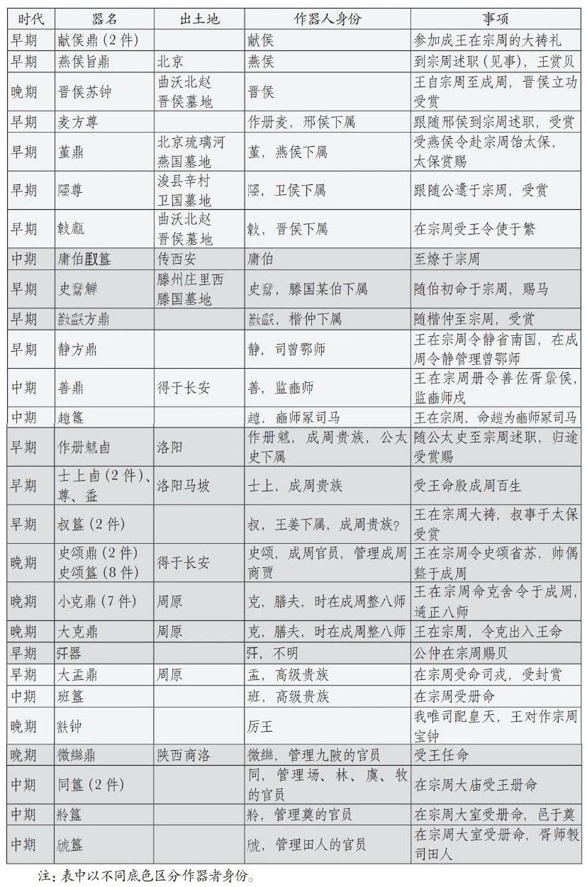 将“宗周”和“周”看作一地需要解决一些问题:为什么一个地方会有两个不同的名称?它们使用时的差异在哪里?这需要认真考察“周”和“宗周”出现的语境。笔者把所有提到“宗周”的铭文汇集成表二,可以看到铜器作器者身份和作器缘由的几种情况: