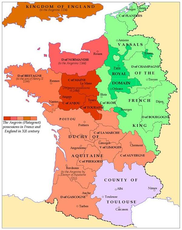 但他们还是在四年后离婚了。1152年3月21日,法国北方的主教们在博让西聚会,宣布宣布路易七世与埃莉诺存在四到五代的血缘关系,他们的婚姻无效(婚姻无效教会的说法,离婚更像是个现代法学概念)。两个月后,埃莉诺在普瓦提埃与法国的另一位大诸侯、安茹伯爵美男子若弗瓦(Geoffroy)的儿子亨利结婚。这次婚变是中世纪欧洲的一个重大事件,它对随后法国和英国的王权都产生了很大影响,后世史家对此有很多评说。路易七世与埃莉诺的联姻让卡佩王室可以与阿基坦这个大诸侯国保持良好关系,即便还不能合并它的话。但埃莉诺再婚后不久,安茹家(又称金雀花家族)的亨利就成为英格兰国王,同时兼任安茹的伯爵和诺曼底的公爵,后来他还向威尔士和爱尔兰扩张。到1170年左右,这对夫妇统治着从苏格兰到比利牛斯山、从爱尔兰岛到法国中部奥弗涅的辽阔地域,人们有时把这个“大西洋之弧”称作“金雀花帝国”,相比之下,诺曼-英格兰的老对手卡佩的逼仄领地简直不值一提了。19世纪的法国史学家认为,这次婚变严重阻碍了法兰西民族国家的成长,他们很自然地迁怒于埃莉诺,米什莱(Michelet)对她的评论就充满了敌意。