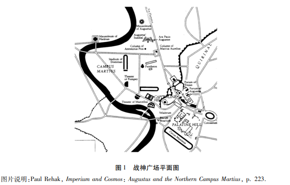 在奥古斯都统治时期,元首崇拜逐渐发展成一种以元首及其家族为崇奉对象的国家宗教,由特定的祭祀团(Sodales Augustales)负责主持元首死后的神化仪式。宗教节庆与仪式是元首构建自身神性的动态手段,相关宗教建筑作为容纳、承接宗教节庆、仪式等公共活动的空间,则为元首神性构建提供了空间上的静态呈现。战神广场原是塔克文家族的属地,位于神圣城界与台伯河之间,因被奉献于战神马尔斯而得名(见图1),它是位于卡匹托尔山、奎里纳尔山、皮奇乌斯山及台伯河之间的开阔之地。战神广场承纳了诸多公共活动,如公民人口普查、征兵(dilectus)、军队集结与训练、百人团大会、特洛伊赛会、共和国官员选举等。