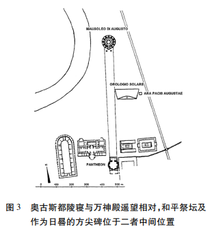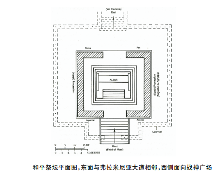 万神殿的建立向整个帝国预演着奥古斯都的终极命运,然而他可与众神比肩,除了承袭自凯撒的神圣血统之外,还需向民众提供更具信服力的理由。公元前13年, 为庆祝奥古斯都从西班牙、高卢行省整顿政务而归,元老院投票通过决议,在战神广场修建供奉奥古斯都和平女神(Ara Pacis Augustae)的祭坛(简称和平祭坛),并命令罗马官员、祭司以及维斯塔贞女进行每年一度的祭祀活动。从空间布局来看,和平祭坛与奥古斯都日晷恰坐落于连接奥古斯都陵寝与万神殿之轴线的中央,沿着弗拉米尼亚大道西侧分布,在这片充斥着武力征服主题的空间中,通过“战争与和平”这一对反差矛盾的意象,强调了奥古斯都的和平缔造者身份,使得奥古斯都脱离了作为必死凡人的命运束缚,最终实现了死后封神,于万神殿前厅中占据一席之地。