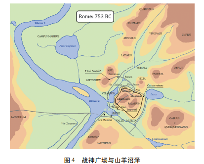 奥古斯都陵墓是其个人及尤利乌斯家族成员死后的临时栖息之所,而万神殿则象征着元首及其家族神化的最终命运。近年来的考古挖掘证实,“万神殿与奥古斯都的陵墓坐落在同一条轴线之上,两座建筑的入口大门相对而望,可能有一条笔直的道路将两座建筑连接起来” (见图3)。这种叙事上的关联通过奥古斯都陵墓与万神殿之间的相对位置实现了视觉与空间上的呈现。根据铭文记载,万神殿始建于公元前27年(“M(arcus) Agrippa L(uci) f(ilius) co(n)s(ul) tertium fecit.”),于公元前25年落成。“阿格里帕希望根据希腊化传统,将一座神庙献给元首,将之与奥林匹斯众神并排而立。”奥古斯都拒绝了该提议,“将凯撒的雕像与众神并列,自己与阿格里帕的雕像被陈列在前厅”。此举体现了奥古斯都对待个人神化的保守态度,因生前封神在罗马传统文化中并无先例。万神殿朝向的区域,正是凯撒胜利女神赛会(Ludi Victoriae Caesaris)举办期间尤利乌斯彗星(Sidus Iulium)出现的方位。尤里乌斯彗星在日落前升起,并连续七日在天空中闪耀,这成为民众深信凯撒化身为神的重要证据,推动了在公元前42年1月1日举行的凯撒官方神化仪式。此外,菲利波·夸雷利认为万神殿的选址可能与罗穆路斯消失之处吻合。相传罗穆路斯在临近山羊沼泽(Palus Caprae)(见图4)之处检阅军队时升入苍穹,化身为神。后尤利乌斯(Proculus Julius)获其显现指引,向罗马民众传达诸神意愿:罗马将会成为世界之首,罗马人应常习战事,并坚信罗马军队是无敌的。万神殿的朝向与选址充分吸纳了罗穆路斯及凯撒封神的神话要素,“塑造了罗马帝国历史中自凯撒神化而开启的帝王神化的象征与范本”。从奥古斯都陵墓至万神殿,在空间上构建了“死亡—飞升封神”的内在关联,并通过“死后神化”的方式在罗马多神教框架内找到了理论依托。位于战神广场中心区域的万神殿向罗马民众预演了奥古斯都的死后飞升,也为之后帝国元首的神化确立了基本范式。在奥古斯都死后,元老院下令将一座神庙献给他,并以崇敬诸神的仪式来崇奉他。