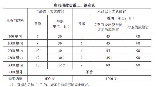 散官番上既然称番,就要有番第,即分为几组,如“五百里内七番”,即居住距京师(皇帝在东都时,以距东都里程为准)500里内的散官,要分为7组轮流番上,这里的“七番”就是番第。但《唐六典》记载的散官参选需“经两番已上”的“两番”,不是番第,而是番次,指要上番两次。番上的时间,就是番期。这是我们首先需要明确的。