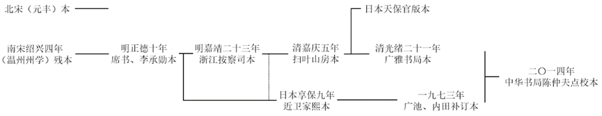 《唐六典》版本渊流并不复杂,相关研究相对较少,观点也相对比较统一。二十世纪三十年代初,玉井是博在北京拍摄《唐六典》宋刊残本、抄录傅增湘手校宋本《通典》后,发表了《〈大唐六典〉及〈通典〉的宋刊本》一文,可以算作近代学人专论《唐六典》版本问题较早的学术研究。该文较为系统、全面地梳理了《唐六典》北宋元丰本、南宋绍兴本、明正德本、明嘉靖本、清扫叶山房本、清广雅书局本和日本享保近卫本、天保官版的版本流传系统,并具体介绍了南宋绍兴本的版本信息和价值。玉井氏所绘《唐六典》版本系统图直至《二十世纪唐研究》仍被沿用,可见其研究的重要意义。