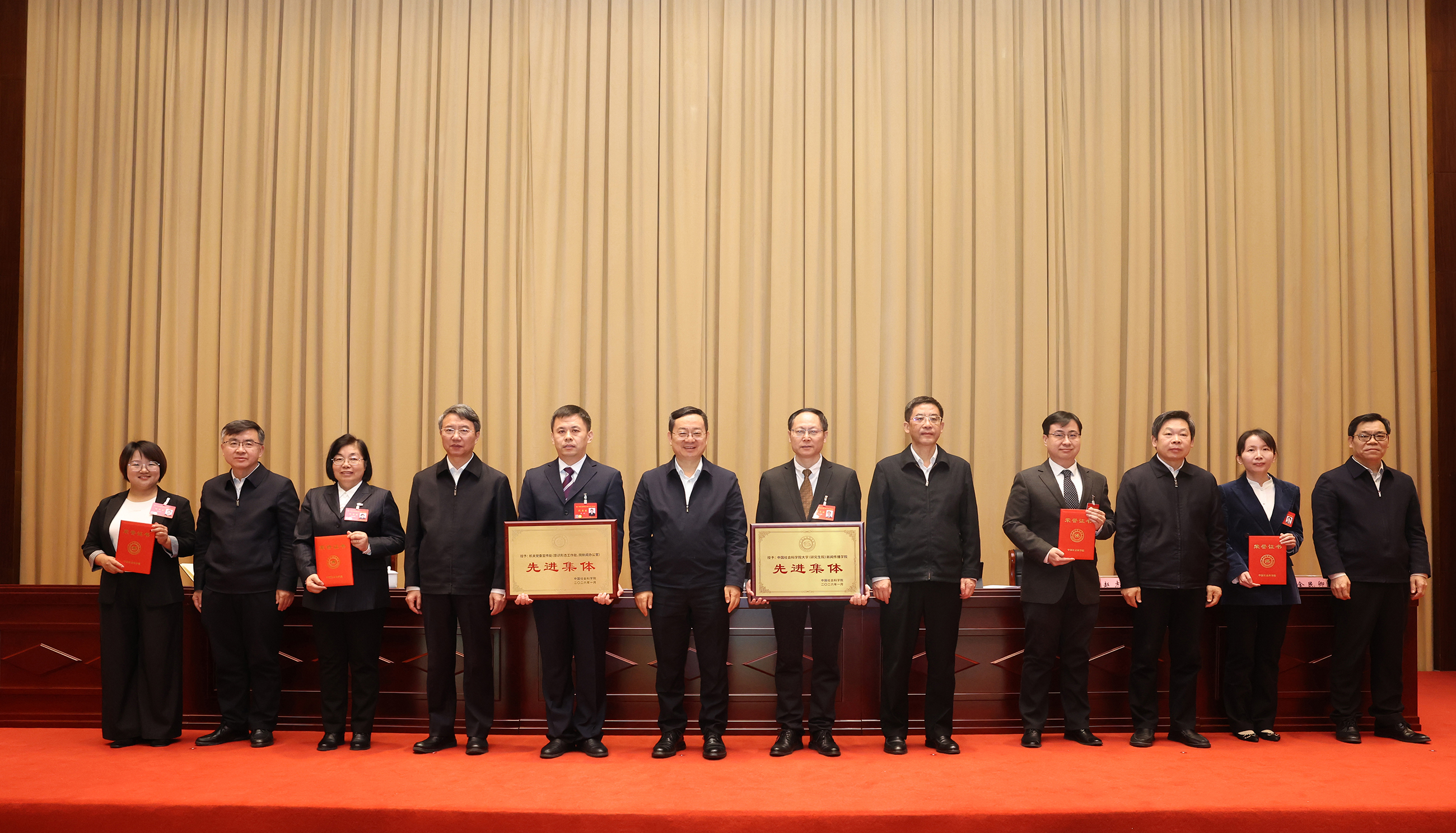 会议期间举行了中国社会科学院2021—2025年度先进集体和先进个人、第十二届院优秀科研成果奖颁奖仪式。院领导为获奖代表颁奖。相关单位代表和青年科研骨干代表作交流发言。