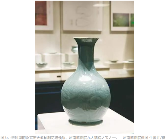 北宋汝官窑天蓝釉刻花鹅颈瓶,1987年出土于河南宝丰清凉寺汝官窑遗址,高19.5厘米,口径5.6厘米,底径8.2厘米,通体施天蓝釉,足端露胎,腹部刻有花叶纹,整器布满开片。在汝官窑遗址考古发掘中,它是唯一一件完整的天蓝釉器物,而且是极为少见的刻花作品。“天下宋瓷,汝窑为魁。”在宋代五大名窑“汝、官、哥、钧、定”中,汝窑位居魁首。现代著名画家、美术教育家李苦禅曾说,“天下博物馆,无汝(瓷)者,难称尽善尽美也”。目前所知道的汝官窑瓷器传世数量不足百件,且多为历代以来的收藏品,发掘器物极少。